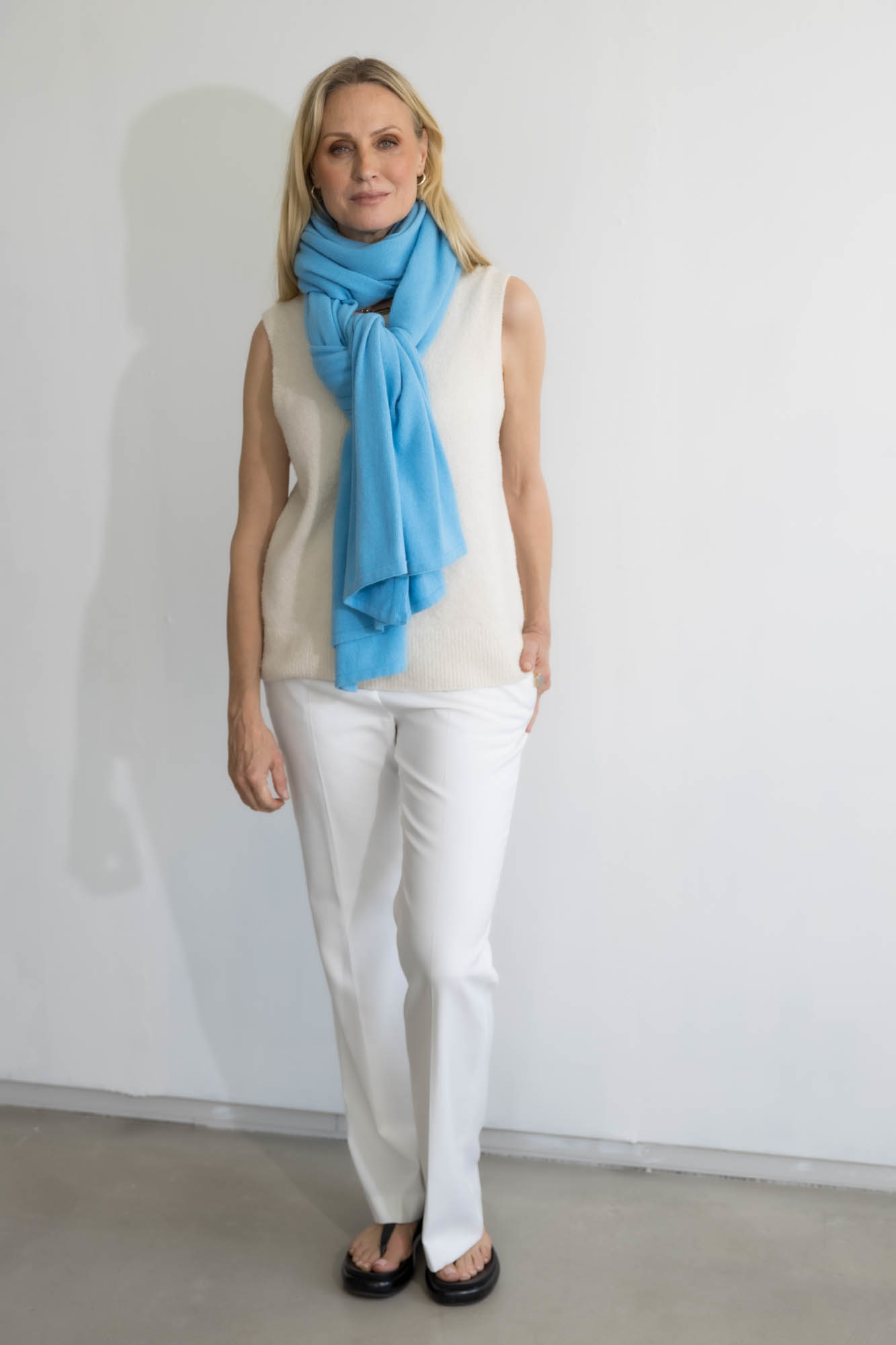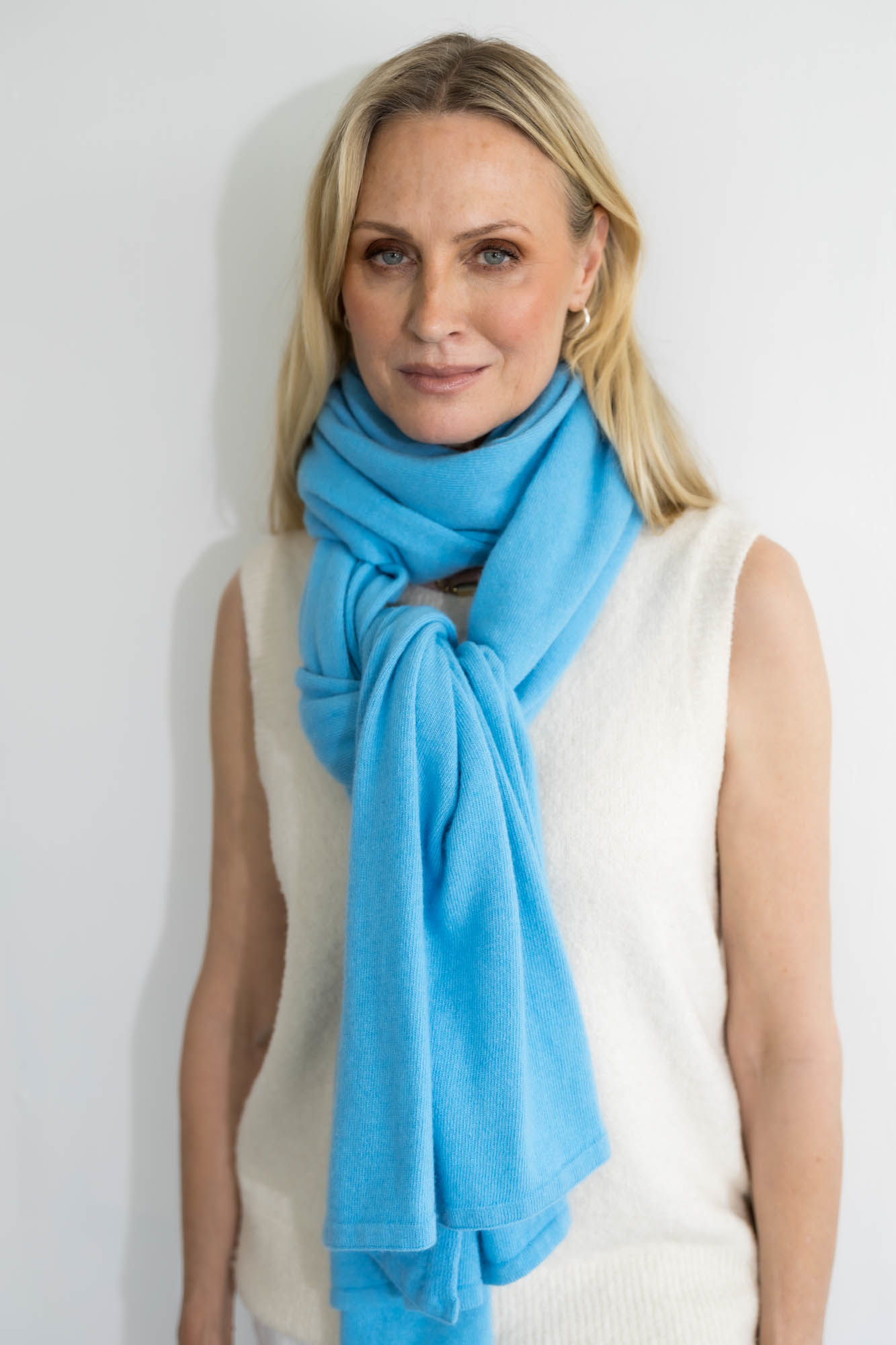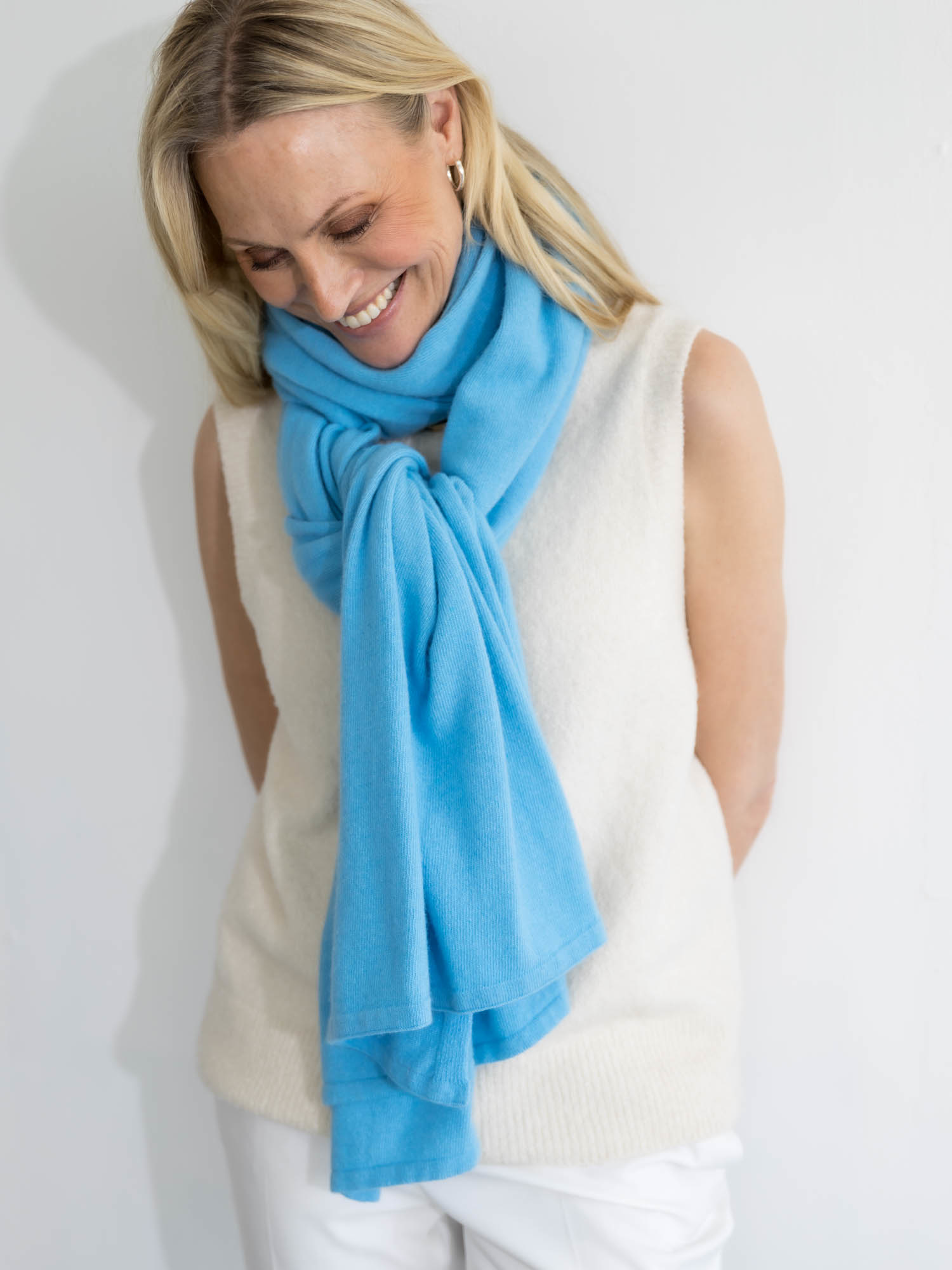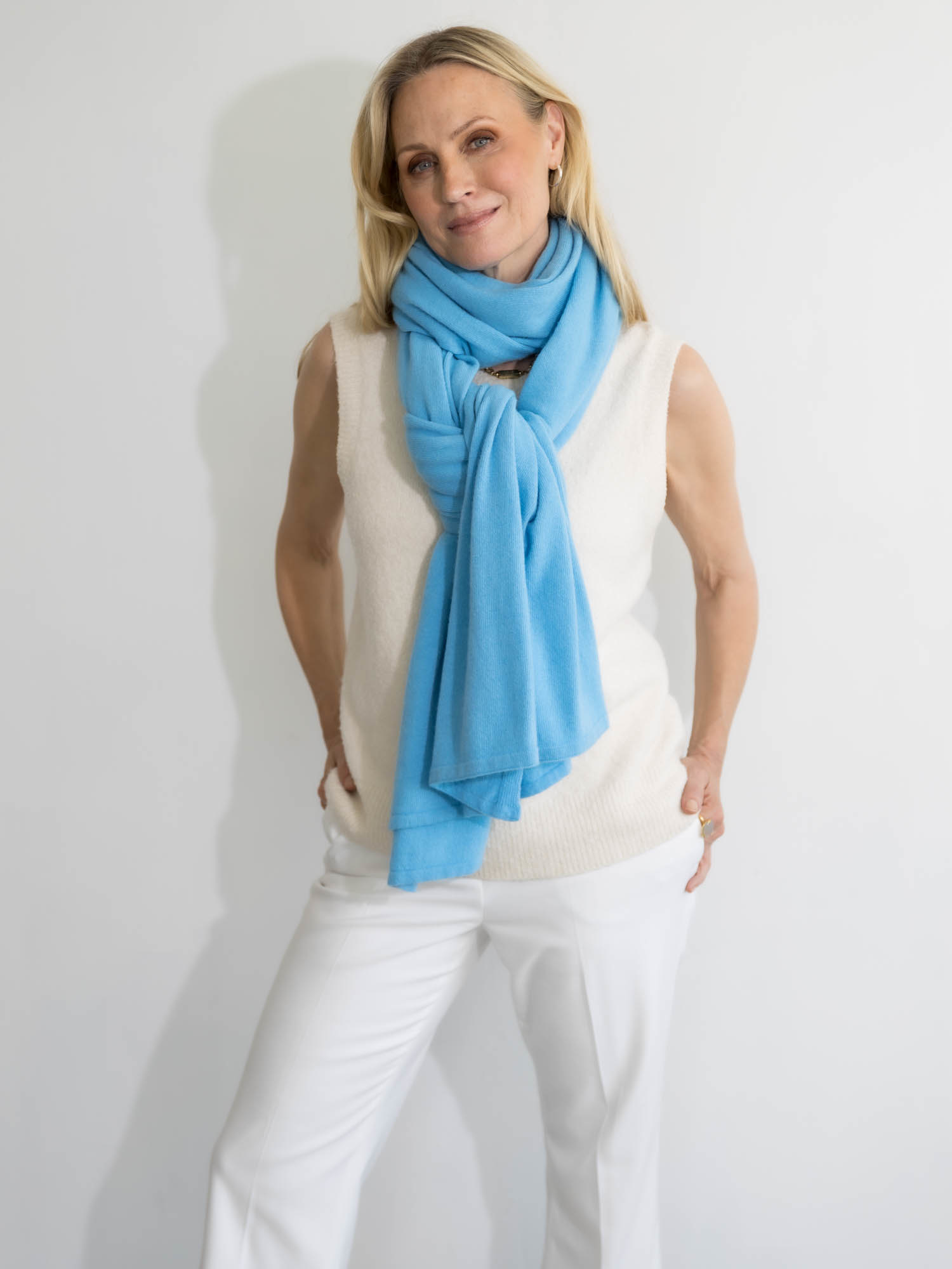 Cosy Chic Azure. Cosy staat voor zacht en warm en dat is deze sjaal dan ook precies. De sjaal is zacht door dat beetje cashmere en warm door de merino wol. Een heerlijke comfortabele sjaal die verslavend lekker is en door het grote formaat ook fijn als omslagdoek te dragen is. Deze sjaal valt als een chique sjaal die perfect gaat naar een zakelijke meeting, een diner, maar is ook een uitkomst op de bank en achter je PC. Deze sjaal is zowel in het voor- en najaar als in de winter een topsjaal. Daarbij is de sjaal heerlijk ruim van formaat. Klik op de afbeelding voor een vergroting.